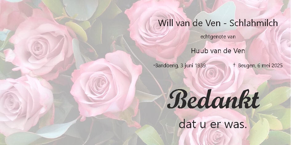 Will werd op 5 mei in bed gevonden met een halfzijdige verlamming. In het ziekenhuis werd een flinke hersenbloeding geconstateerd. Op 6 mei om 5 voor 11 in de ochtend is ze overleden in het bijzijn van Huub.