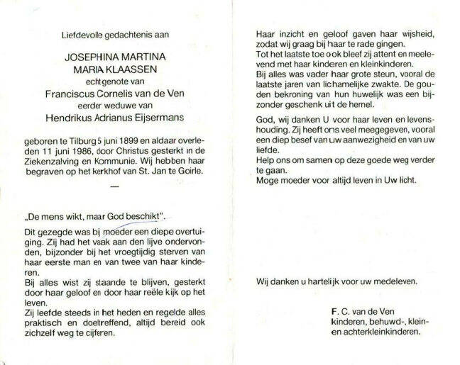 Frans en Fien trouwde op 19-02-1935. Het jonge stel had lef. Fien was een ondernemende vrouw. Frans van de Ven was boerenknecht bij ome Drik. Zij moeten zeker voor hun huwelijk met elkaar gepraat hebben hoe zij de kost zouden verdienen. Het eigen huis aan de Bergstraat 104 was nagenoeg afbetaald. Dat kwam omdat Moeder van de Ven – Klaassen zuinig leefde toen zij nog getrouwd was, maar ook als weduwe hard werkte met de was doen voor mensen.