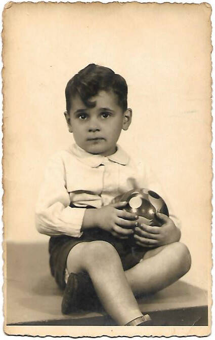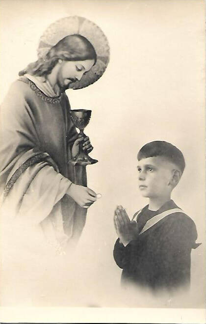 Een foto als peuter en een foto voor zijn eerste communie; in een matrozenpakje, want dat was toen heel erg in.