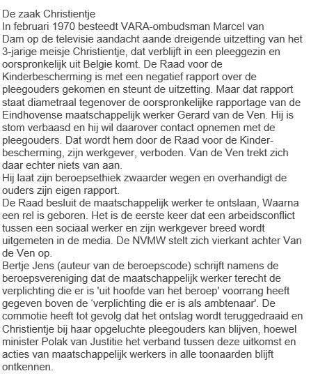 Toen er jaren later na de zaak Christientje, die speelde in 1969-1970, een boekje over de eregalerij van de beroepsvereniging voor sociaal werkers uitkwam, wist hij nog van niets (niet dat hij erin vermeld stond, en evenmin dat hij was opgenomen in de eregalerij van de beroepsvereniging).